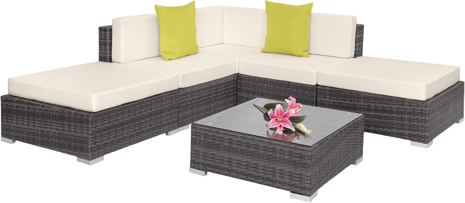 Conjunto de Jardín de Ratán y Aluminio tectake con Cojines de 10 cm, Resistente al Clima, 3 Sillones, 1 Puf, 1 Mesa de Cristal, Fundas Desmontables - Gris